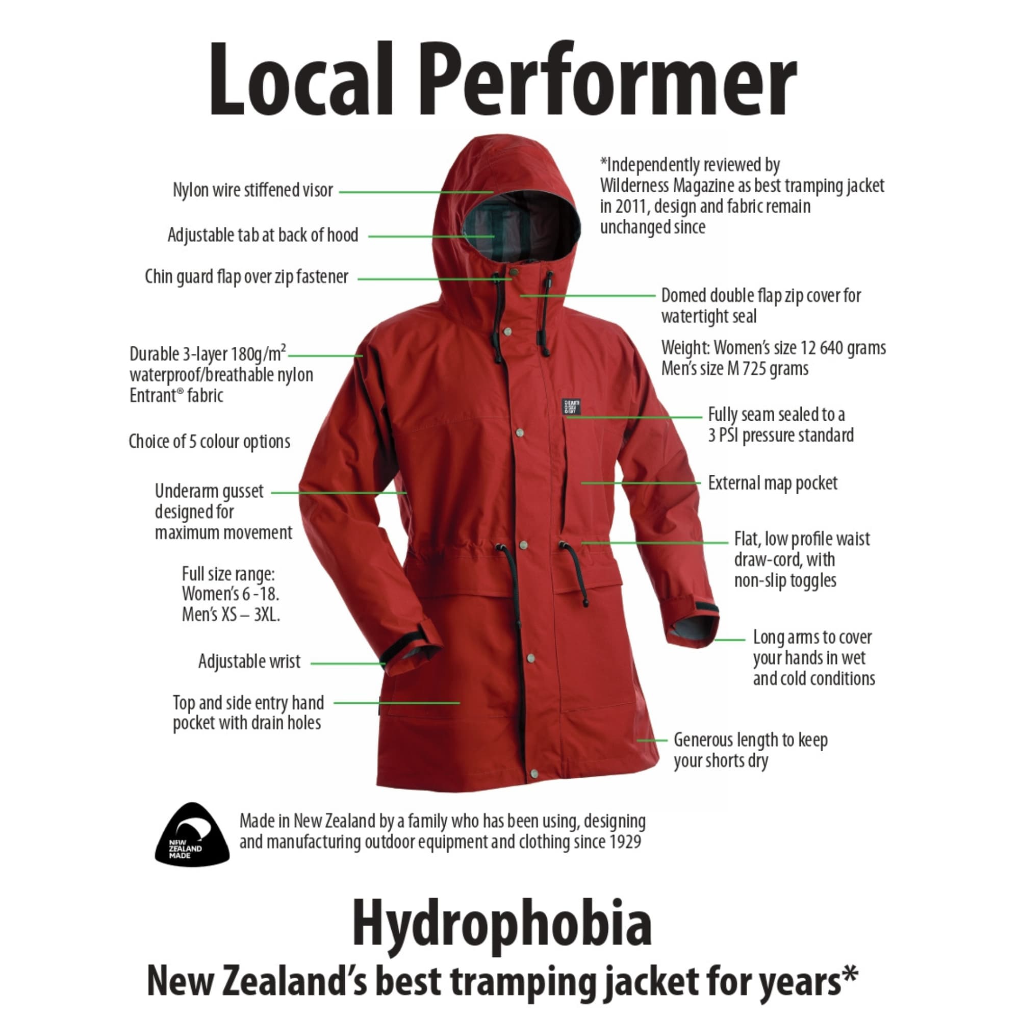 Extremely happy with this Jacket. The length, the fit and even the weight for a fully waterproof and hardwearing tramping Jacket. Protects not only from Torrential rain but also from bitterly cold biting winds. Good protection around the shoulders, most I’ve had always seem to give first in the shoulders with the weight of a heavy pack. It’s worth the money considering other Jackets/Coats on the market and I’ve been through a few and its fully NZ made. I don’t know what took me so long to decide to purchase one of these. Thanks so much ESSky.